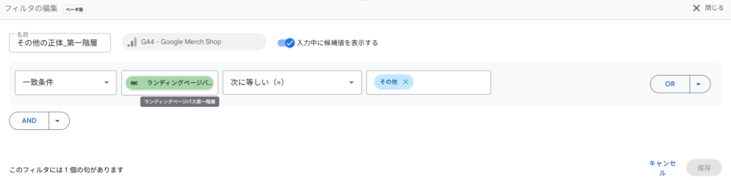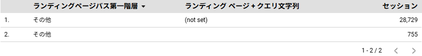 ランディングページパス第一階層で行った場合、以下のように(not set)と空白行が含まれていることが分かる。