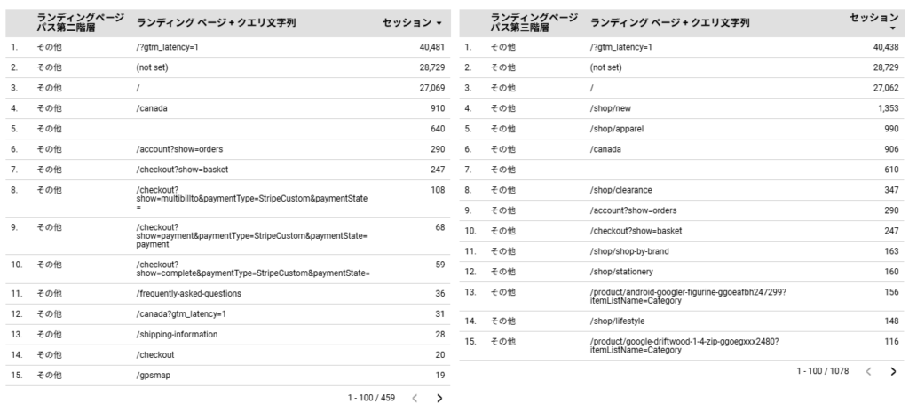 Google Merchandise Storeの場合、TOPページやceckoutはノーリファラー、productは自然検索、shopやcanada、searchはUnassignedが最も割合が高くなっている。