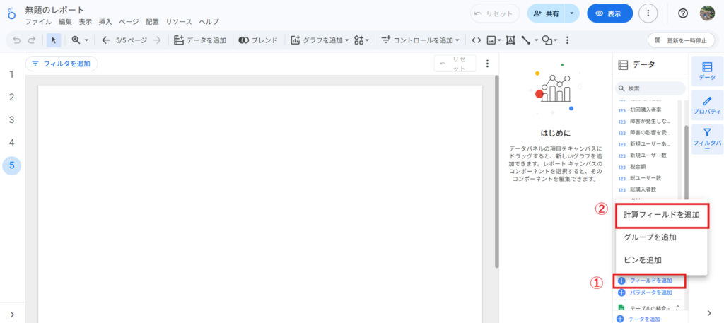 まず、Looker Studioを開き、画面を「編集」モードにする。画面右横の「データ」タブから、「⊕フィールドを追加」>「計算フィールドを追加」をクリックする。