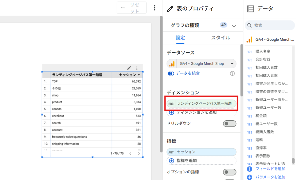 次に、表グラフを選択し、ディメンションに先ほど作成したフィールドをセットし、指標は任意で設定する。