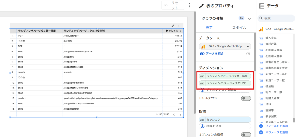 各階層ごとにまとめたディレクトリが、意図したルールのもときちんと振り分けられているかを確認したい場合は、「ランディングページ+クエリ文字列」のディメンションをかけあわせてみよう。