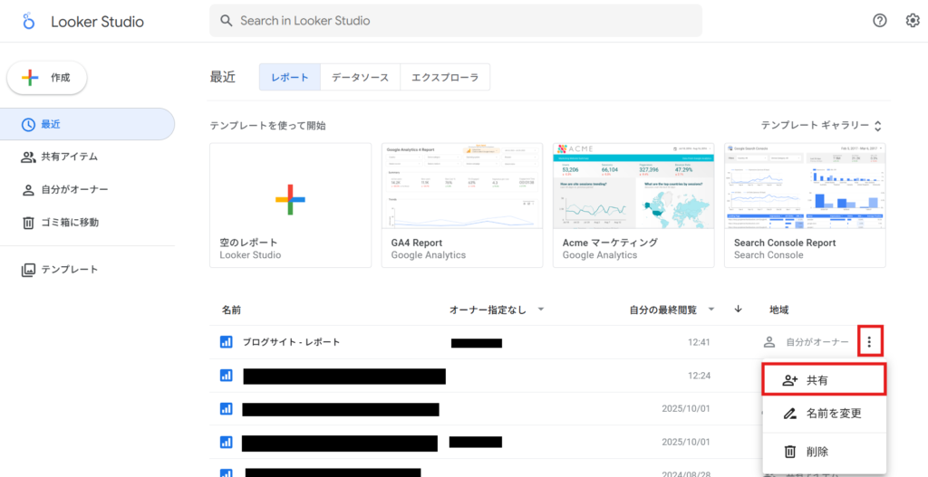 Looker Studioのホーム画面から該当のレポートを見つけ、一番右にマウスオーバーすると「︙」が表れるため、クリックし、「共有」を選択する。