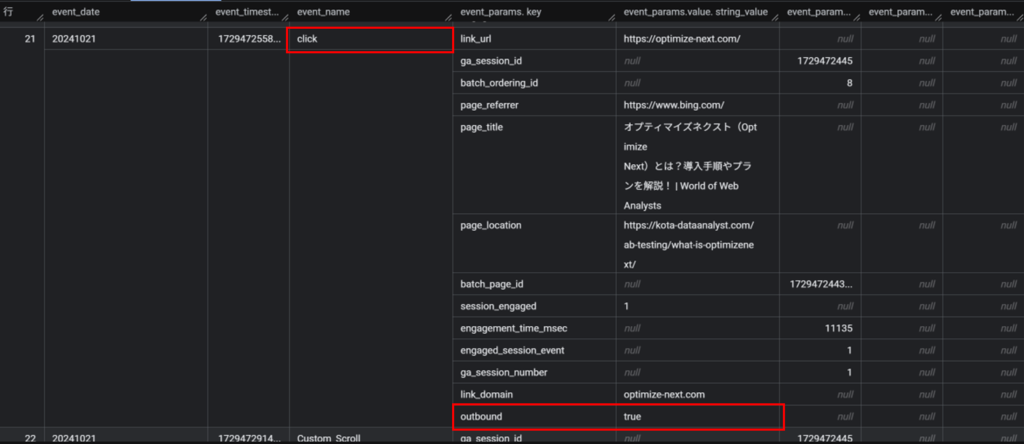 そしてoutboundパラメータだが、これは通常clickイベントに紐づくイベントパラメータで、外部リンクのクリックが発生すると「outbound = true」が記録される。