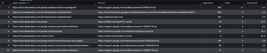 あとは各テーブルから必要なカラムを抽出し、クリック率は、百分率になるかたちで小数点第一位まで算出している。